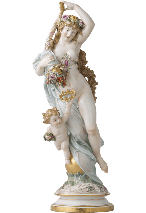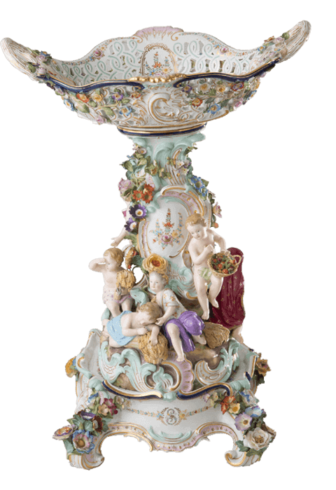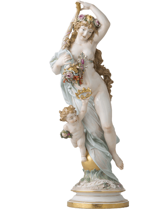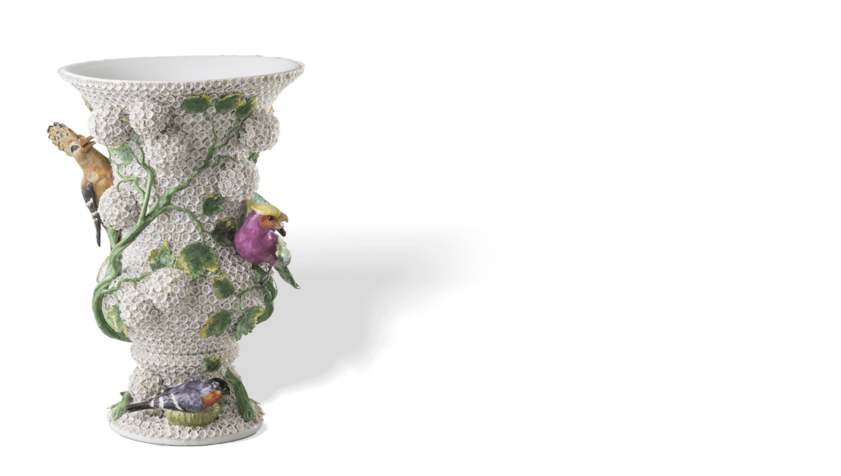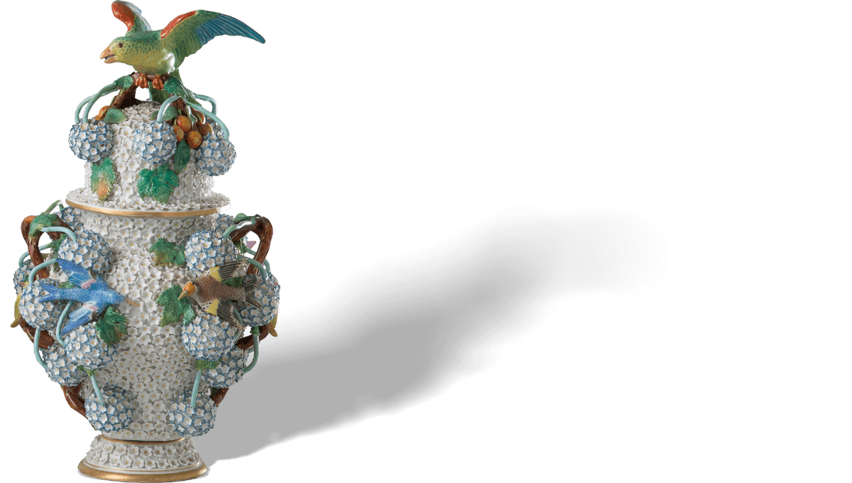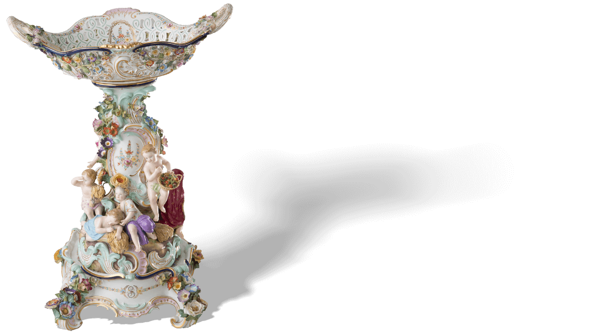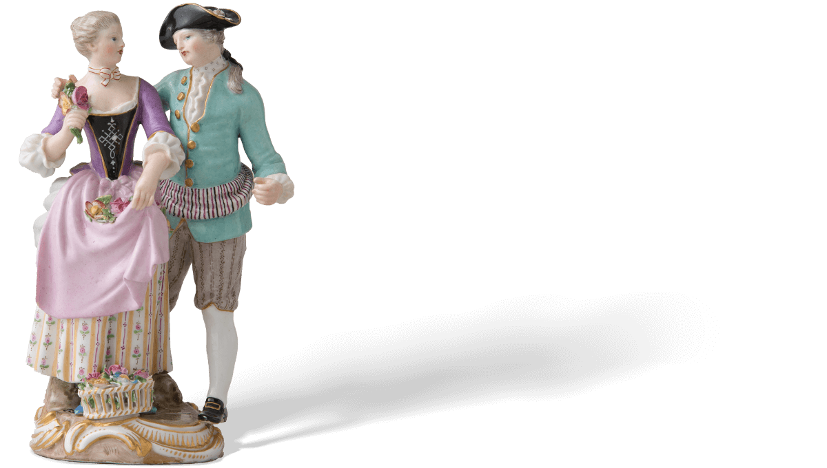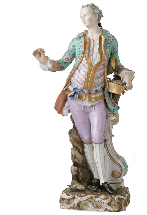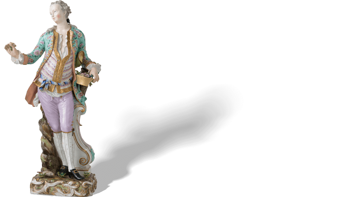 在梅森瓷兴起之前,洋溢着异域风情的东方瓷器对西方当权者有着极大的吸引力。 同时,他们对瓷器本土化的创造始终持有高涨的热情。18世纪的欧洲宫廷宴会极尽奢华,以糖雕点缀佐餐食品是甜点桌的一大特色。 梅森瓷的诞生,为欧洲瓷器的发展奠定了基础,瓷雕也逐渐出现在欧洲的甜点宴会之上,并成为流行趋势。 伴随社交场合由大型宴会厅转向个人沙龙,适用于小型空间的瓷雕需求激增。 才华横溢的雕塑家约翰·约阿希姆·肯德勒(Johann Joachim Kaendler)将巴洛克、洛可可等欧洲装饰艺术与瓷器结合,主题涉及宫廷风俗与神话传说, 使梅森瓷完美契合了新时代的需求。时至今日,梅森瓷塑像的魅力仍未褪色。